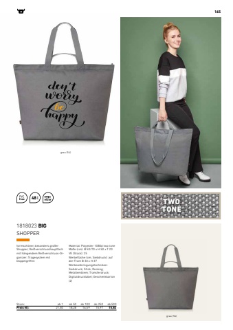 TWOTONE48 l1651818023 BIGSt%u00fcck: ab 1 ab 50 ab 100 ab 250 ab 500Preis (%u20ac): 21,50 18,28 16,59 15,97 15,82SHOPPERformsch%u00f6ner, besonders gro%u00dfer Shopper; Rei%u00dfverschlusshauptfach mit h%u00e4ngendem Rei%u00dfverschluss-Organizer; Tragesystem mit Doppelgriffen Material: Polyester 1080d two toneMa%u00dfe (cm): B 50/70 x H 50 x T 20VE (St%u00fcck): 25Werbefl%u00e4che (cm, Siebdruck): auf der Front B 33 x H 37Werbeanbringungstechniken: Siebdruck; Stick; Doming; Metallemblem; Transferdruck; Digitaldrucklabel; Geschenkkarton (2)grau (54)grau (54)