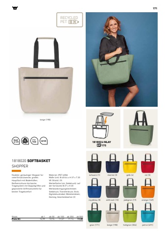 RECYCLED PET1711818020 SOFTBASKET1818024 INLAY175St%u00fcck: ab 1 ab 50 ab 100 ab 250 ab 500Preis (%u20ac): 14,99 12,74 11,57 11,14 11,03SHOPPERflexibler, ger%u00e4umiger Shopper f%u00fcr viele Einsatzzwecke; gro%u00dfes Hauptfach mit Bodenf%u00fc%u00dfen; Rei%u00dfverschluss-Vortasche; Tragesystem mit Doppelgriffen und gepolsterte Griffmanschette f%u00fcr besten TragekomfortMaterial: rPET 600dMa%u00dfe (cm): B 40/44 x H 37 x T 20VE (St%u00fcck): 25Werbefl%u00e4che (cm, Siebdruck): auf der Vortasche B 27 x H 20Werbeanbringungstechniken: Siebdruck; Transferdruck; Stick; Digitaldrucklabel; Metallemblem; Doming; Geschenkkarton (2)schwarz (1) marine (3)anthrazit (10)beige (198) petrol (691)beige (198)royalblau (8)gr%u00fcn (171) hellgr%u00fcn (306)jadegr%u00fcn (19) orange (169)gelb (4) rot (5)