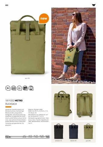 new18 l 130221819202 METROSt%u00fcck: ab 1 ab 50 ab 100 ab 250 ab 500Preis (%u20ac): 25,20 21,42 19,44 18,72 18,54RUCKSACKattraktiver Freizeitrucksack mit Wickelverschluss, hochwertiger Metallschlie%u00dfe und gen%u00e4hten Handgriffen; Volumenerweiterung; Hauptfach mit gepolstertem Ger%u00e4tefach; gro%u00dfe Rei%u00dfverschluss-Vortasche; zwei seitliche Einsteckf%u00e4cher; gro%u00dfes Rei%u00dfverschluss-Seitenfach r%u00fcckseitig; gut gepolstertes Tragesystem Material: Poyester 600dMa%u00dfe (cm): B 27 x H 37/49 x T 15VE (St%u00fcck): 20Werbefl%u00e4che (cm, Siebdruck): auf der Vortasche B 17 x H 16Werbeanbringungstechniken: Siebdruck, Stick, Transfer, Digitaldrucklabel, Metallemblem, Geschenkkarton (1)schwarz (1) marine (3) gr%u00fcn (55)gr%u00fcn (55)