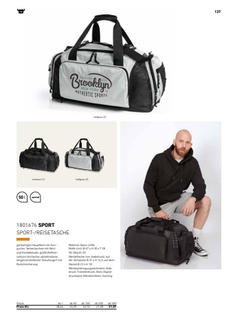 50 l1371801676 SPORTSt%u00fcck: ab 1 ab 50 ab 100 ab 250 ab 500Preis (%u20ac): 28,64 24,35 22,10 21,28 21,07SPORT-/REISETASCHEger%u00e4umiges Hauptfach mit Zurrgurten; Seitentaschen mit Netzund Kordelbesatz; gro%u00dfe Rei%u00dfverschluss-Vortasche; abnehmbarer, l%u00e4ngenverstellbarer Schultergurt mit RutschsicherungMaterial: Nylon 420dMa%u00dfe (cm): B 57 x H 30 x T 28VE (St%u00fcck): 20Werbefl%u00e4che (cm, Siebdruck): auf der Vortasche B 31 x H 14,5; auf dem Deckel B 22 x H 18Werbeanbringungstechniken: Siebdruck; Transferdruck; Stick; Digitaldrucklabel; Metallemblem; Domingschwarz (1) hellgrau (2)hellgrau (2)