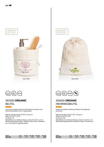 ORGANICCOTTONORGANICCOTTON164 1815021 ORGANIC 1816061 ORGANICSt%u00fcck: ab 1 ab 50 ab 100 ab 250 ab 500Preis (%u20ac): 2,44 2,07 1,88 1,81 1,79St%u00fcck: ab 1 ab 50 ab 100 ab 250 ab 500Preis (%u20ac): 6,72 5,71 5,18 4,99 4,94MEHRWEGBEUTELwiederverwendbarer Mehrzweck-Beutel mit ZugkordelVerschlussMaterial: Bio-Baumwolle 5 OZ (~142 g/m%u00b2)Ma%u00dfe (cm): B 30 x H 40VE (St%u00fcck): 250Werbefl%u00e4che (cm, Siebdruck Basic): auf der Front B 21 x H 6Werbeanbringungstechniken: Siebdruck Basic; Transferdrucknatur (704)BEUTELuniversell einsetzbarer Beutel mit Kordelzug-Verschluss; drei flache Einsteckf%u00e4cher innen; TrageschlaufeMaterial: Bio-Baumwolle 10 OZ (~312 g/m2)Ma%u00dfe (cm): %u00d8 17 x H 23VE (St%u00fcck): 50Werbefl%u00e4che (cm, Siebdruck Basic): auf der Front B 17 x H 13Werbeanbringungstechniken: Siebdruck Basic; Stick; Metallemblem; Transferdruck; Digitaldrucklabelnatur (704)