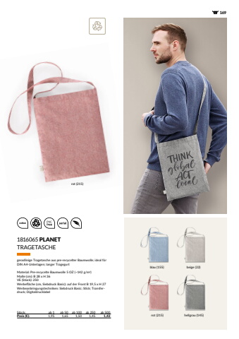 1691816065PLANETSt%u00fcck: ab 1 ab 50 ab 100 ab 250 ab 500Preis (%u20ac): 1,95 1,65 1,50 1,45 1,43TRAGETASCHEgeradlinige Tragetasche aus pre-recycelter Baumwolle; ideal f%u00fcr DIN A4-Unterlagen; langer TragegurtMaterial: Pre-recycelte Baumwolle 5 OZ (~142 g/m2) Ma%u00dfe (cm): B 28 x H 36 VE (St%u00fcck): 250 Werbefl%u00e4che (cm, Siebdruck Basic): auf der Front B 19,5 x H 27 Werbeanbringungstechniken: Siebdruck Basic; Stick; Transferdruck; Digitaldrucklabelrot (215) hellgrau (145)rot (215)blau (155) beige (22)