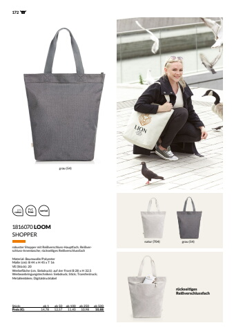 172 1816070 LOOMSt%u00fcck: ab 1 ab 50 ab 100 ab 250 ab 500Preis (%u20ac): 14,78 12,57 11,40 10,98 10,88SHOPPERrobuster Shopper mit Rei%u00dfverschluss-Hauptfach; Rei%u00dfverschluss-Innentasche; r%u00fcckseitiges Rei%u00dfverschlussfach Material: Baumwolle/PolyesterMa%u00dfe (cm): B 44 x H 45 x T 16VE (St%u00fcck): 20Werbefl%u00e4che (cm, Siebdruck): auf der Front B 28 x H 32,5Werbeanbringungstechniken: Siebdruck; Stick; Transferdruck; Metallemblem; Digitaldrucklabelnatur (704) grau (54)grau (54)r%u00fcckseitiges Rei%u00dfverschlussfach