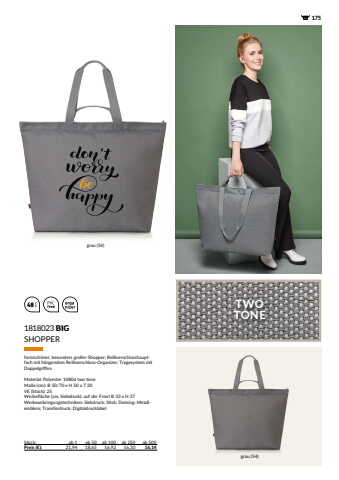 TWOTONE48 l 1751818023BIGSt%u00fcck: ab 1 ab 50 ab 100 ab 250 ab 500Preis (%u20ac): 21,94 18,65 16,92 16,30 16,14SHOPPERformsch%u00f6ner, besonders gro%u00dfer Shopper; Rei%u00dfverschlusshauptfach mit h%u00e4ngendem Rei%u00dfverschluss-Organizer; Tragesystem mit Doppelgriffen Material: Polyester 1080d two toneMa%u00dfe (cm): B 50/70 x H 50 x T 20VE (St%u00fcck): 25Werbefl%u00e4che (cm, Siebdruck): auf der Front B 33 x H 37Werbeanbringungstechniken: Siebdruck; Stick; Doming; Metallemblem; Transferdruck; Digitaldrucklabelgrau (54)grau (54)