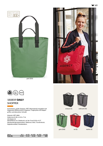 1771818019 DAILYSt%u00fcck: ab 1 ab 50 ab 100 ab 250 ab 500Preis (%u20ac): 13,58 11,54 10,48 10,09 9,99SHOPPERformsch%u00f6ner, gro%u00dfer Shopper; rPET-Obermaterial; Hauptfach mit h%u00e4ngendem Rei%u00dfverschluss-Organizer; Tragesystem mit Doppelgriffen und dekorativer Schnalle Material: rPET 600dMa%u00dfe (cm): B 40 x H 43 x T 16VE (St%u00fcck): 25Werbefl%u00e4che (cm, Siebdruck): auf der Front B 28 x H 27Werbeanbringungstechniken: Siebdruck; Stick; Transferdruck; Digitaldrucklabel; Metallemblemanthrazit (10)gr%u00fcn (223)gr%u00fcn (223)marine (3)schwarz (1)rot (5)