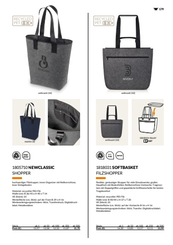 1791805710 NEWCLASSIC 1818031 SOFTBASKET1818024 INLAY187St%u00fcck: ab 1 ab 50 ab 100 ab 250 ab 500Preis (%u20ac): 15,97 13,58 12,32 11,87 11,75St%u00fcck: ab 1 ab 50 ab 100 ab 250 ab 500Preis (%u20ac): 16,30 13,85 12,57 12,11 11,99SHOPPERhochwertiger Filzshopper; innen Organizer mit Rei%u00dfverschluss; loser EinlegebodenMaterial: recycelter PES FilzMa%u00dfe (cm): B 26/45 x H 40 x T 14VE (St%u00fcck): 25Werbefl%u00e4che (cm, Stick): auf der Front B 29 x H 16Werbeanbringungstechniken: Stick; Transferdruck; Digitaldrucklabel; Metallemblemanthrazit (10)marine (3)flexibler, ger%u00e4umiger Shopper f%u00fcr viele Einsatzwecke; gro%u00dfes Hauptfach mit Bodenf%u00fc%u00dfen; Rei%u00dfverschluss-Vortasche; Tragesystem mit Doppelgriffen und gepolsterte Griffmanschette f%u00fcr besten TragekomfortMaterial: recycelter PES FilzMa%u00dfe (cm): B 40/44 x H 37 x T 20VE (St%u00fcck): 25Werbefl%u00e4che (cm, Stick): auf der Vortasche B 16 x H 16Werbeanbringungstechniken: Stick; Transfer; Digitaldrucklabel; MetallemblemFILZSHOPPERanthrazit (10)anthrazit (10)