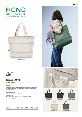 1811818055 MONOSt%u00fcck: ab 1 ab 50 ab 100 ab 250 ab 500Preis (%u20ac): 27,59 23,45 21,29 20,50 20,30SHOPPERinnovativer Strick-Shopper; attraktive Kachel-Optik: Monomaterial; gro%u00dfes Hauptfach mit h%u00e4ngendem Organizer; ergonomisch geformte Tr%u00e4gerMaterial: PolyesterMa%u00dfe (cm): B 36 x H 36 x T 18 VE (St%u00fcck): 25Werbefl%u00e4che (cm, Stick): auf der Front B 28,5 x H 10Werbeanbringungstechniken: Stick; Transfer; Metallemblemschwarz (1) marine (3)gr%u00fcngrau (644)offwhite (222)offwhite (222)mittelgrau (115)