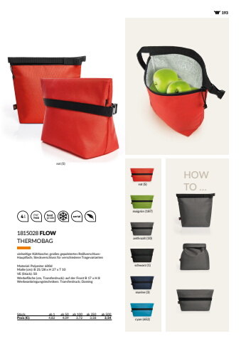 4 lHOW TO %u2026 1931815028 FLOWSt%u00fcck: ab 1 ab 50 ab 100 ab 250 ab 500Preis (%u20ac): 4,82 4,09 3,72 3,58 3,54THERMOBAGvielseitige K%u00fchltasche; gro%u00dfes gepolstertes Rei%u00dfverschlussHauptfach; Steckverschluss f%u00fcr verschiedene TragevariantenMaterial: Polyester 600dMa%u00dfe (cm): B 21/28 x H 27 x T 10VE (St%u00fcck): 50Werbefl%u00e4che (cm, Transferdruck): auf der Front B 17 x H 8Werbeanbringungstechniken: Transferdruck; Domingmaigr%u00fcn (187)rot (5)rot (5)marine (3)schwarz (1)anthrazit (10)cyan (652)