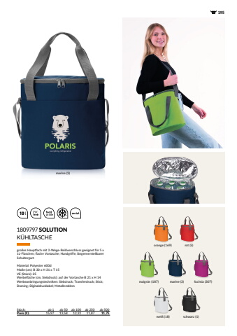 10 l 1951809797SOLUTIONSt%u00fcck: ab 1 ab 50 ab 100 ab 250 ab 500Preis (%u20ac): 15,97 13,58 12,32 11,87 11,75K%u00dcHLTASCHEgro%u00dfes Hauptfach mit 2-Wege-Rei%u00dfverschluss geeignet f%u00fcr 5 x 1L-Flaschen; flache Vortasche; Handgriffe; l%u00e4ngenverstellbarer SchultergurtMaterial: Polyester 600dMa%u00dfe (cm): B 30 x H 31 x T 15VE (St%u00fcck): 25Werbefl%u00e4che (cm, Siebdruck): auf der Vortasche B 21 x H 14Werbeanbringungstechniken: Siebdruck; Transferdruck; Stick; Doming; Digitaldrucklabel; Metallemblemorange (169) rot (5)marine (3)marine (3)schwarz (1)maigr%u00fcn (187) fuchsia (307)wei%u00df (18)