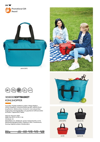 22 lPromotional Gift Award200 1818030SOFTBASKETSt%u00fcck: ab 1 ab 50 ab 100 ab 250 ab 500Preis (%u20ac): 23,04 19,59 17,78 17,12 16,95K%u00dcHLSHOPPERinnovativer flexibler K%u00fchlkorb; gro%u00dfes 2-Wege-Rei%u00dfverschluss-Hauptfach; Volumenerweiterung %u00fcber seitliche Druckknopflaschen; Rei%u00dfverschluss-Vortasche; innen abwaschbar; Tragesystem mit Doppelgriffen und gepolsterte Griffmanschette f%u00fcr besten Tragekomfort; faltbarMaterial: Polyester 600dMa%u00dfe (cm): B 41 x H 25 x T 20VE (St%u00fcck): 10Werbefl%u00e4che (cm, Siebdruck): auf der Vortasche B 25 x H 10Werbeanbringungstechniken: Siebdruck; Stick; Transferdruck; Doming; Digitaldrucklabel; Metallemblemrot (5) marine (3)petrol (691) schwarz (1)petrol (691)