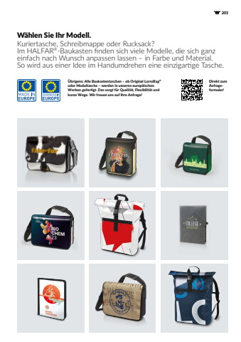203W%u00e4hlen Sie Ihr Modell.Kuriertasche, Schreibmappe oder Rucksack? Im HALFAR%u00ae-Baukasten finden sich viele Modelle, die sich ganz einfach nach Wunsch anpassen lassen %u2013 in Farbe und Material. So wird aus einer Idee im Handumdrehen eine einzigartige Tasche.%u00dcbrigens: Alle Baukastentaschen %u2013 ob Original LorryBag%u00aeoder Modultasche %u2013 werden in unseren europ%u00e4ischen Werken gefertigt. Das sorgt f%u00fcr Qualit%u00e4t, Flexibilit%u00e4t und kurze Wege. Wir freuen uns auf Ihre Anfrage!Direkt zum Anfrageformular!