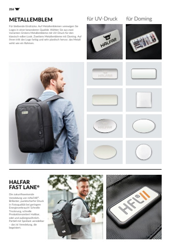 216 METALLEMBLEM f%u00fcr UV-Druck f%u00fcr DomingF%u00fcr bleibende Eindr%u00fccke. Auf Metallemblemen verewigen Sie Logos in einer besonderen Qualit%u00e4t. W%u00e4hlen Sie aus zwei Varianten: Erstens Metallembleme mit UV-Druck f%u00fcr den klassisch-edlen Look. Zweitens Metallembleme mit Doming. Auf ihnen tritt das Logo farbig und sehr plastisch hervor, das Metall wirkt wie ein Rahmen. HALFAR FAST LANE%u00aeDie zukunftsweisende Veredelung von HALFAR%u00ae.Brillanter, punktscharfer Druck in Fotoqualit%u00e4t bei geringem Energieverbrauch! Schnelle Trocknung, schnelle Produktionszeiten! Haltbar, edel und au%u00dfergew%u00f6hnlich. Partiell mit Spotlack veredelbar %u2013 das ist Veredelung, die begeistert.