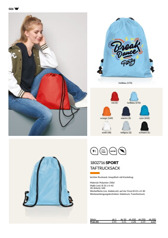 9 l026 1802716 SPORTSt%u00fcck: ab 1 ab 50 ab 100 ab 250 ab 500Preis (%u20ac): 2,95 2,51 2,28 2,19 2,17orange (169)rot (5)marine (3)hellgrau (2) schwarz (1)hellblau (170)hellblau (170)cyan (652)wei%u00df (18)leichter Rucksack; Hauptfach mit KordelzugMaterial: Polyester 210dMa%u00dfe (cm): B 33 x H 42VE (St%u00fcck): 100Werbefl%u00e4che (cm, Siebdruck): auf der Front B 23 x H 30Werbeanbringungstechniken: Siebdruck; TransferdruckTAFTRUCKSACK