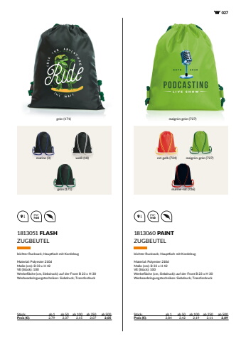 9 l 9 l 0271813051 FLASH 1813060 PAINT St%u00fcck: ab 1 ab 50 ab 100 ab 250 ab 500Preis (%u20ac): 2,79 2,37 2,15 2,07 2,05St%u00fcck: ab 1 ab 50 ab 100 ab 250 ab 500Preis (%u20ac): 2,84 2,42 2,19 2,11 2,09leichter Rucksack; Hauptfach mit KordelzugMaterial: Polyester 210dMa%u00dfe (cm): B 33 x H 42VE (St%u00fcck): 100Werbefl%u00e4che (cm, Siebdruck): auf der Front B 23 x H 30Werbeanbringungstechniken: Siebdruck; Transferdruckleichter Rucksack; Hauptfach mit KordelzugMaterial: Polyester 210dMa%u00dfe (cm): B 33 x H 42VE (St%u00fcck): 100Werbefl%u00e4che (cm, Siebdruck): auf der Front B 23 x H 30Werbeanbringungstechniken: Siebdruck; TransferdruckZUGBEUTEL ZUGBEUTELrot-gelb (724) maigr%u00fcn-gr%u00fcn (727)marine-rot (726)marine (3) wei%u00df (18)gr%u00fcn (171)gr%u00fcn (171) maigr%u00fcn-gr%u00fcn (727)