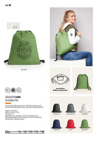11 l028 1816079 CARESt%u00fcck: ab 1 ab 50 ab 100 ab 250 ab 500Preis (%u20ac): 7,29 6,20 5,63 5,42 5,37ZUGBEUTELfunktioneller Zugbeutel-Rucksack; rPET-Obermaterial; Hauptfach mit Kordelzug; Rei%u00dfverschluss-Innenfach; extradicke KordelMaterial: rPET 300dMa%u00dfe (cm): B 36 x H 44VE (St%u00fcck): 50Werbefl%u00e4che (cm, Siebdruck): auf der Front B 28 x H 33Werbeanbringungstechniken: Siebdruck; Stick; Transferdruck; Metallemblem; Digitaldrucklabelanthrazit (10)marine (3)schwarz (1) wei%u00df (18)rot (5) gr%u00fcn (55)gr%u00fcn (55)verstecktes Rei%u00dfverschlussfach