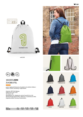 12 l 0291813055JOINSt%u00fcck: ab 1 ab 50 ab 100 ab 250 ab 500Preis (%u20ac): 5,38 4,57 4,15 3,99 3,96marine (3)wei%u00df (18)wei%u00df (18)schwarz (1)orange (169)maigr%u00fcn (187)gro%u00dfer Zugbeutel-Rucksack; Hauptfach mit seitlicher Rei%u00dfverschluss-Tasche; Kordelzug; TrageschlaufeMaterial: rPET Mini RipstopMa%u00dfe (cm): B 36 x H 45VE (St%u00fcck): 100Werbefl%u00e4che (cm, Siebdruck): auf der Front B 23 x H 34Werbeanbringungstechniken: Siebdruck; Transferdruck; Stick; Digitaldrucklabel; Doming; MetallemblemZUGBEUTEL anthrazit (10)dunkelrot (197)cyan (652)rot (5)