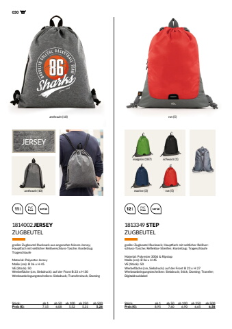 11 lJERSEY12 l030 1814002JERSEY 1813349 STEPSt%u00fcck: ab 1 ab 50 ab 100 ab 250 ab 500Preis (%u20ac): 7,15 6,08 5,52 5,31 5,26St%u00fcck: ab 1 ab 50 ab 100 ab 250 ab 500Preis (%u20ac): 8,95 7,60 6,90 6,65 6,58anthrazit (10)anthrazit (10)gro%u00dfer Zugbeutel-Rucksack aus angenehm feinem Jersey; Hauptfach mit seitlicher Rei%u00dfverschluss-Tasche; Kordelzug; TrageschlaufeMaterial: Polyester JerseyMa%u00dfe (cm): B 36 x H 45VE (St%u00fcck): 50Werbefl%u00e4che (cm, Siebdruck): auf der Front B 23 x H 30Werbeanbringungstechniken: Siebdruck; Transferdruck; DomingZUGBEUTELgro%u00dfer Zugbeutel-Rucksack; Hauptfach mit seitlicher Rei%u00dfverschluss-Tasche; Reflektor-Streifen; Kordelzug; TrageschlaufeMaterial: Polyester 300d & RipstopMa%u00dfe (cm): B 36 x H 45VE (St%u00fcck): 50Werbefl%u00e4che (cm, Siebdruck): auf der Front B 23 x H 27Werbeanbringungstechniken: Siebdruck; Stick; Doming; Transfer; DigitaldrucklabelZUGBEUTELmarine (3)maigr%u00fcn (187) schwarz (1)rot (5)rot (5)