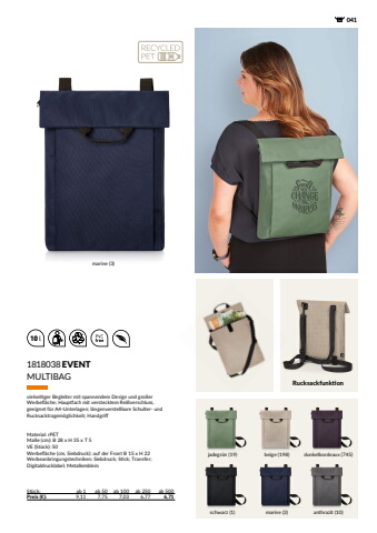 10 l 0411818038EVENTSt%u00fcck: ab 1 ab 50 ab 100 ab 250 ab 500Preis (%u20ac): 9,11 7,75 7,03 6,77 6,71MULTIBAGvielseitiger Begleiter mit spannendem Design und gro%u00dfer Werbefl%u00e4che; Hauptfach mit verstecktem Rei%u00dfverschluss, geeignet f%u00fcr A4-Unterlagen; l%u00e4ngenverstellbare Schulter- und Rucksacktragem%u00f6glichkeit; HandgriffMaterial: rPETMa%u00dfe (cm): B 28 x H 35 x T 5VE (St%u00fcck): 50Werbefl%u00e4che (cm, Siebdruck): auf der Front B 15 x H 22Werbeanbringungstechniken: Siebdruck; Stick; Transfer; Digitaldrucklabel; Metallemblemmarine (3)marine (3)jadegr%u00fcn (19)schwarz (1) anthrazit (10)beige (198) dunkelbordeaux (745)Rucksackfunktion