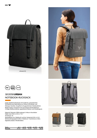 16 l042 1813058URBANSt%u00fcck: ab 1 ab 50 ab 100 ab 250 ab 500Preis (%u20ac): 29,53 25,10 22,78 21,93 21,72junger Notebook-Rucksack mit moderner, geometrischer Schnittf%u00fchrung; Materialmix aus Velours-Kunstleder und Melange-Gewebe; Hauptfach mit gepolstertem Notebookfach; Rei%u00dfverschluss-Vortasche mit zwei flachen Einsteckf%u00e4chern; 2-Wege-Rei%u00dfverschl%u00fcsse; gepolsterter R%u00fccken und SchultergurteMaterial: Polyester 300d melange & Velours-KunstlederMa%u00dfe (cm): B 32 x H 41 x T 15VE (St%u00fcck): 10Werbefl%u00e4che (cm, Siebdruck): auf der Vortasche B 24 x H 14Werbeanbringungstechniken: Siebdruck; Transferdruck; Stick; Digitaldrucklabel; MetallemblemNOTEBOOK-RUCKSACKbraun (735) grau (54) schwarz (1)schwarz (1)