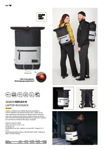 14 l054 1818039REFLEX MSt%u00fcck: ab 1 ab 50 ab 100 ab 250 ab 500Preis (%u20ac): 35,32 31,25 29,34 28,26 27,99LAPTOP-RUCKSACKschwarz (1)stylisher, reflektierender Rolltop-Rucksack mit Rei%u00dfverschluss-Hauptfach und Steckverschluss; HFL%u00ae-Tr%u00e4ger f%u00fcr Ihr Logo; gepolstertes Einsteckfach und Rei%u00dfverschluss-Netzfach innen; zwei seitliche Einsteckf%u00e4cher; Rei%u00dfverschluss-Vortasche; LED-Fahrradlicht-Befestigungsm%u00f6glichkeit; gepolstertes Tragesystem mit h%u00f6henverstellbarem Brustgurt; HandgriffMaterial: Polyester 600dMa%u00dfe (cm): B 26 x H 39 x T 16VE (St%u00fcck): 10Werbefl%u00e4che (cm, HFL%u00ae-Sticker): auf dem HFL%u00ae-Tr%u00e4ger B 5,7 x H 2,3Werbeanbringungstechniken: HALFAR FAST LANE%u00ae; Siebdruck; Stick; Transfer; DomingLED-FahrradlichtBefestigungsm%u00f6glichkeit