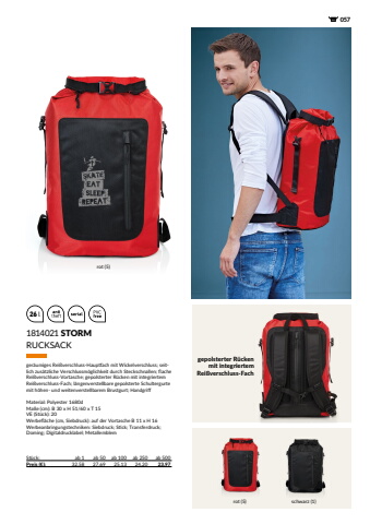 26 l 0571814021 STORMSt%u00fcck: ab 1 ab 50 ab 100 ab 250 ab 500Preis (%u20ac): 32,58 27,69 25,13 24,20 23,97ger%u00e4umiges Rei%u00dfverschluss-Hauptfach mit Wickelverschluss; seitlich zus%u00e4tzliche Verschlussm%u00f6glichkeit durch Steckschnallen; flache Rei%u00dfverschluss-Vortasche; gepolsterter R%u00fccken mit integriertem Rei%u00dfverschluss-Fach; l%u00e4ngenverstellbare gepolsterte Schultergurte mit h%u00f6hen- und weitenverstellbarem Brustgurt; HandgriffMaterial: Polyester 1680dMa%u00dfe (cm): B 30 x H 51/60 x T 15VE (St%u00fcck): 20Werbefl%u00e4che (cm, Siebdruck): auf der Vortasche B 11 x H 16Werbeanbringungstechniken: Siebdruck; Stick; Transferdruck; Doming; Digitaldrucklabel; MetallemblemRUCKSACKrot (5)rot (5) schwarz (1)gepolsterter R%u00fccken mit integriertem Rei%u00dfverschluss-Fach