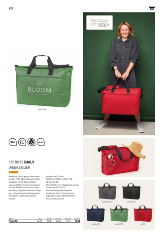 RECYCLED PET36 l1201818033 DAILYSt%u00fcck: ab 1 ab 50 ab 100 ab 250 ab 500Preis (%u20ac): 26,26 22,32 20,26 19,51 19,32WEEKENDERmoderner, leicht gepolsterter Weekender; rPET-Obermaterial; gro%u00dfes Hauptfach mit 2-Wege-Rei%u00dfverschluss; Rei%u00dfverschluss-Vortasche; flaches Rei%u00dfverschlussfach innen; beidseitig l%u00e4ngenverstellbarer Tragegurt mit gen%u00e4htem Schulterpolster; Handgriffe mit DruckknopfmanschetteMaterial: rPET 600dMa%u00dfe (cm): B 50 x H 38 x T 20VE (St%u00fcck): 20Werbefl%u00e4che (cm, Siebdruck): auf der Vortasche B 35 x H 20Werbeanbringungstechniken: Siebdruck; Stick; Transferdruck; Digitaldrucklabel; Metallemblem; Geschenkkarton (2)anthrazit (10)gr%u00fcn (223)gr%u00fcn (223)marine (3)schwarz (1)rot (5)