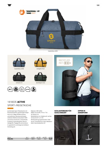 44 lRECYCLED PET1311818035 ACTIVESt%u00fcck: ab 1 ab 50 ab 100 ab 250 ab 500Preis (%u20ac): 43,63 38,59 36,24 34,9 34,57SPORT-/REISETASCHEkomfortable Sport-Reisetasche mit Rucksackfunktion; ger%u00e4umiges Hauptfach mit 2-Wege-Rei%u00dfverschluss und seitlichen Steckverschl%u00fcssen; seitliches Rei%u00dfverschlussfach; Rei%u00dfverschluss-Vortasche; umlaufendes Funktions-Schlaufenband; diverse Handgriffe; Tragegriffe und versteckte, gepolsterte und l%u00e4ngenverstellbare Schultergurte Material: rPET 600dMa%u00dfe (cm): B 58 x H 34 x T 34VE (St%u00fcck): 20Werbefl%u00e4che (cm, Siebdruck): auf der Vortasche B 14 x H 20Werbeanbringungstechniken: Siebdruck; Transferdruck; Stick; Metallemblem; Geschenkkarton (2)ZIPPER IN ANKERFORMSCHLAUFENBAND F%u00dcR SCHULTERGURTdunkelgr%u00fcn (44)taubenblau (455)taubenblau (455)schwarz (1)senfgelb (742)
