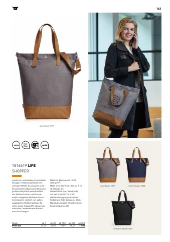 1631816519 LIFESt%u00fcck: ab 1 ab 50 ab 100 ab 250 ab 500Preis (%u20ac): 24,23 20,60 18,69 18,00 17,83SHOPPERmoderner, aufw%u00e4ndig verarbeiteter Shopper; liebevoll gestaltet mit wertigen Metall-Accessoires und beschichteten Baumwoll-Bes%u00e4tzen; gro%u00dfes Hauptfach verschlie%u00dfbar mit Rei%u00dfverschluss und Druckknopf; h%u00e4ngende Rei%u00dfverschlussInnentasche; seitlich von au%u00dfen zug%u00e4ngliche Rei%u00dfverschluss-Tasche; lange Tragegriffe; l%u00e4ngenverstellbarer, abnehmbarer Baumwoll-SchultergurtMaterial: Baumwolle 12 OZ (340 g/m%u00b2)Ma%u00dfe (cm): B 29/44 x H 45 x T 16VE (St%u00fcck): 25Werbefl%u00e4che (cm, Siebdruck): auf der Front B 22 x H 18Werbeanbringungstechniken: Siebdruck; Transferdruck; Stick; Digitaldrucklabel; Metallemblem; Geschenkkarton (2)schwarz-schwarz (60)grau-braun (309)grau-braun (309)marine-braun (308)