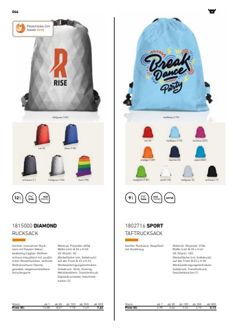 12 l 9 l0461815000 DIAMOND 1802716 SPORTSt%u00fcck: ab 1 ab 50 ab 100 ab 250 ab 500Preis (%u20ac): 10,08 8,57 7,78 7,49 7,42St%u00fcck: ab 1 ab 50 ab 100 ab 250 ab 500Preis (%u20ac): 2,90 2,46 2,24 2,15 2,13rot (5) blau (155)hellgrau (145) bunt (95)hellgrau (145)schwarz (1)RUCKSACKleichter, innovativer Rucksack mit Rauten-Dekor; beidseitig tragbar; Rei%u00dfverschluss-Hauptfach mit zus%u00e4tzlicher Wickelfunktion; seitliche Rei%u00dfverschluss-Tasche; gewebte, l%u00e4ngenverstellbare SchultergurteMaterial: Polyester 600dMa%u00dfe (cm): B 35 x H 50VE (St%u00fcck): 50Werbefl%u00e4che (cm, Siebdruck): auf der Front B 23 x H 33Werbeanbringungstechniken: Siebdruck; Stick; Doming; Metallemblem; Transferdruck; Digitaldrucklabel; Geschenkkarton (2)orange (169)rot (5)marine (3)hellgrau (2) schwarz (1)hellblau (170) fuchsia (307)hellblau (170)cyan (652)maigr%u00fcn (187) wei%u00df (18)leichter Rucksack; Hauptfach mit KordelzugMaterial: Polyester 210dMa%u00dfe (cm): B 33 x H 42VE (St%u00fcck): 100Werbefl%u00e4che (cm, Siebdruck): auf der Front B 23 x H 30Werbeanbringungstechniken:Siebdruck; Transferdruck; Geschenkkarton (1)TAFTRUCKSACK